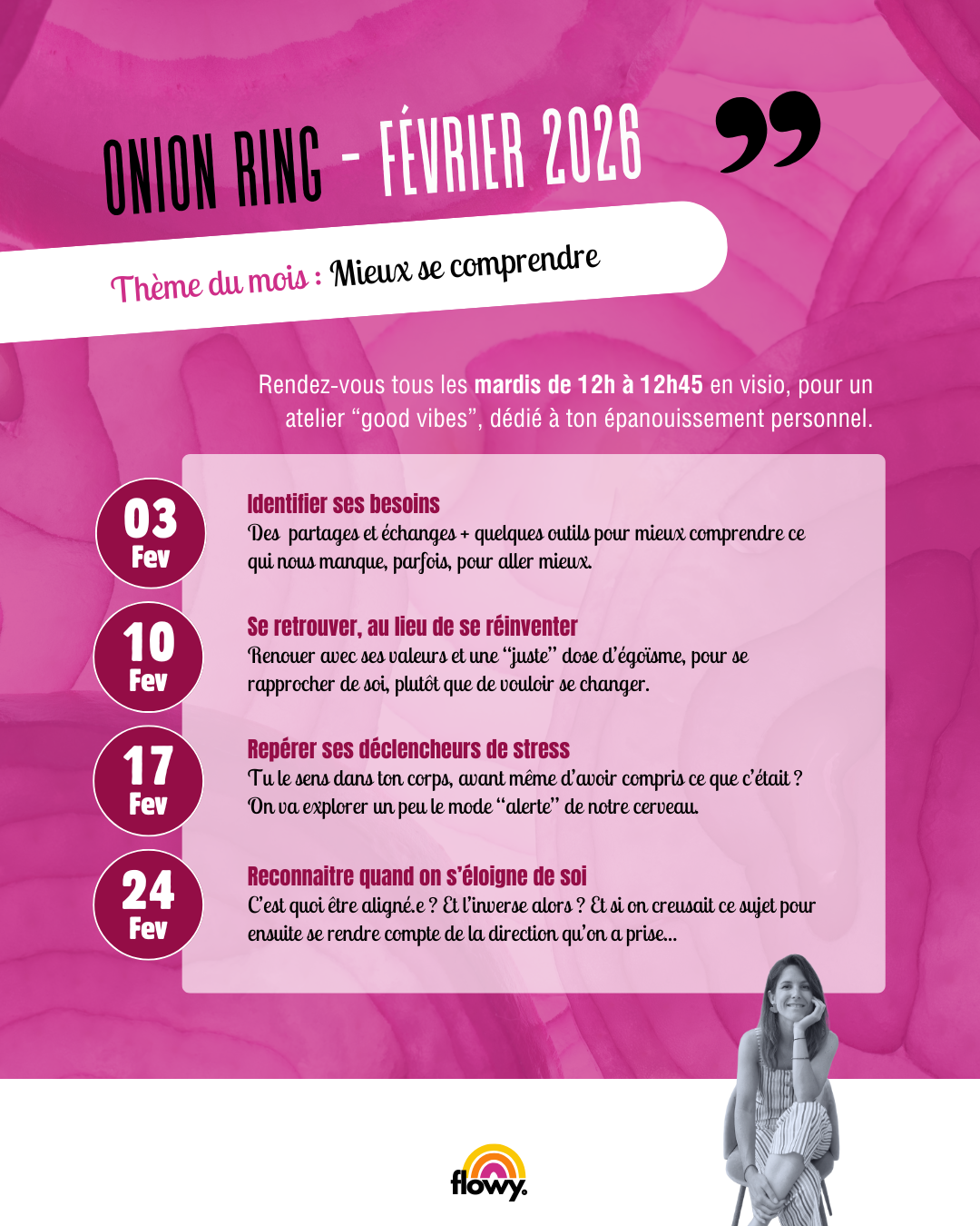 Tu t’es rendu·e compte qu’on ne t’avait rien appris pour prendre soin de ta santé mentale ? Émotions, pensées, angoisses… Tu dois te débrouiller ! Chez flowy on a décidé que ça devait changer : avec le Club Onion Ring on propose d'apprendre ensemble, sans prise de tête, à mieux s’occuper de "son intérieur" (#bifidus). Chaque mardi (12h-12h45) : 1 atelier visio pour découvrir des outils concrets et échanger librement.