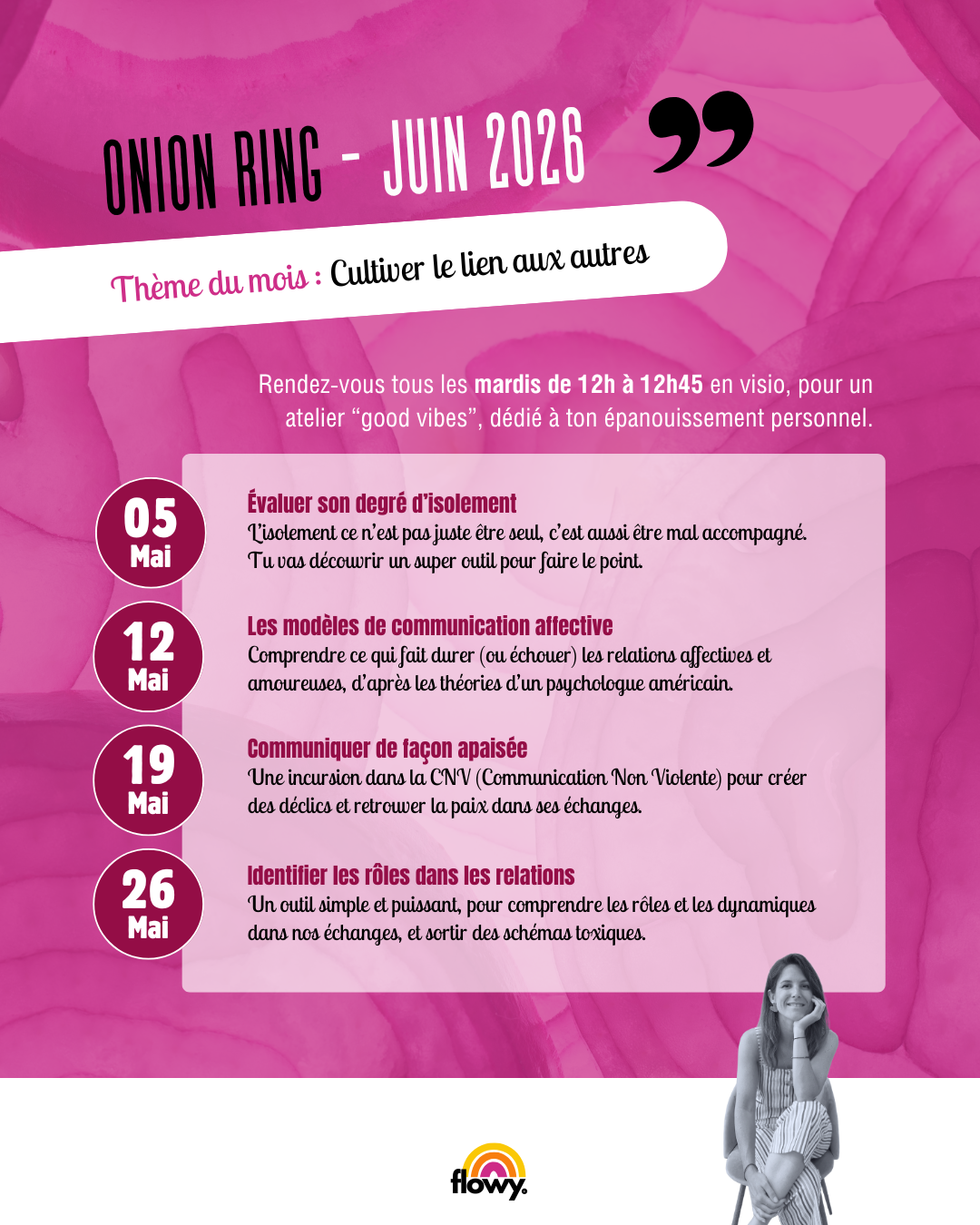 Tu t’es rendu·e compte qu’on ne t’avait rien appris pour prendre soin de ta santé mentale ? Émotions, pensées, angoisses… Tu dois te débrouiller ! Chez flowy on a décidé que ça devait changer : avec le Club Onion Ring on propose d'apprendre ensemble, sans prise de tête, à mieux s’occuper de "son intérieur" (#bifidus). Chaque mardi (12h-12h45) : 1 atelier visio pour découvrir des outils concrets et échanger librement.